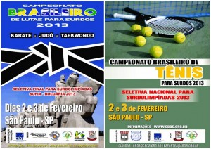 A CBDS promoverá o Campeonato Brasileiro de Lutas para Surdos 2013, nas modalidades de judô, karatê e taekwondo, nos dias 02 e 03 de fevereiro, na capital de São Paulo – SP. E ao mesmo tempo, terá o evento para Tênis que será inédito.