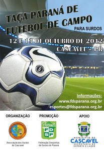 A Diretoria de Esportes da FDSP promoverá a inédita Taça Paraná de Futebol de Campo para Surdos 2012, na categoria masculina, para os dias 12 e 13 de outubro, em Cascavel – PR, contando com o apoio da Surdovel e SEMEL de Cascavel para a organização do evento.