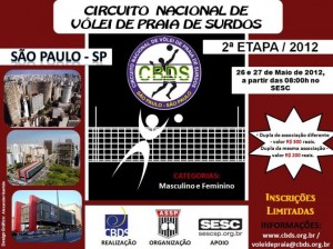 A CBDS está promovendo os jogos da 2ª etapa do Circuito Nacional de Vôlei de Praia para Surdos 2012, nas modalidades masculina e feminina, nos dias 25 e 26 de maio, em São Paulo – SP, que conta com o apoio da organização da ASSP.